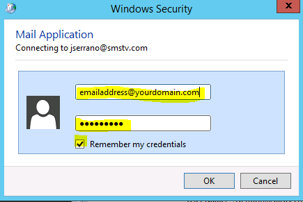 8. Substitute your full email address and assigned password and be sure to select "Remember my credentials"